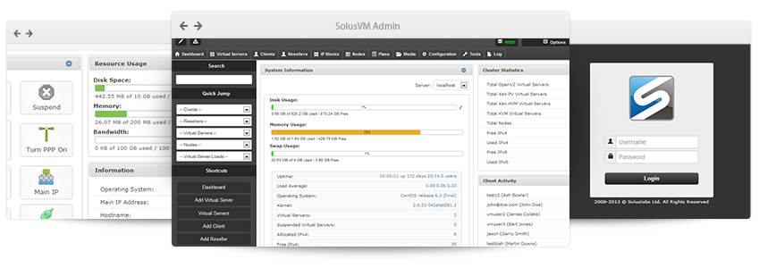 Mit einer umfangreichen und nutzerfreundlichen grafischen Oberfläche unterstützt SolusVM OpenVZ, Linux KVM, Xen Paravirtualization sowie Xen HVM.
